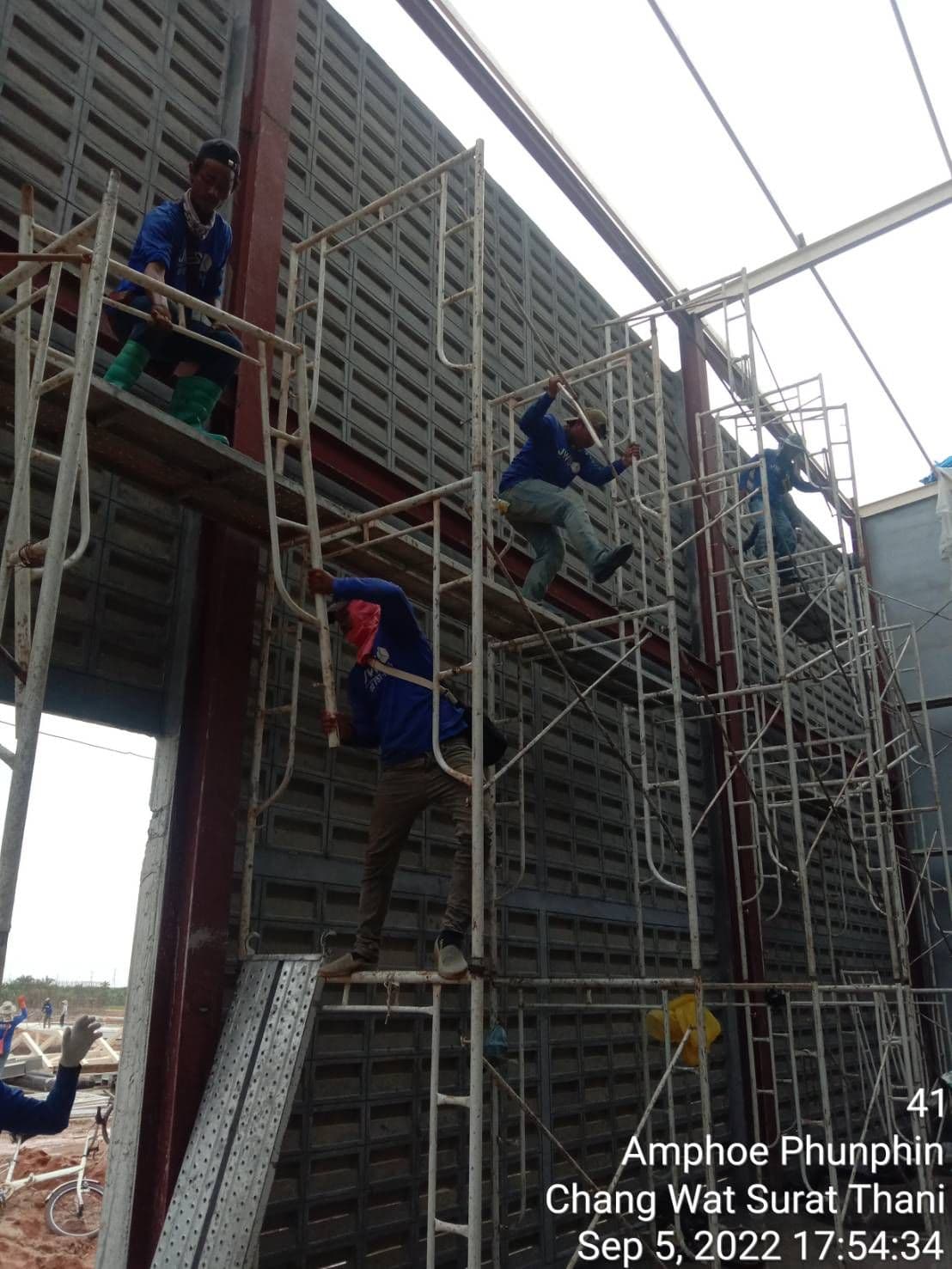 โครงการก่อสร้างโรงงาน จ.สุราษฎร์ธานี โดย ผู้รับเหมาก่อสร้าง บริษัท JWS มั่นใจใช้ อิฐบล็อกช่องลมลับแล ขนาด 9 x19x39 cm. เพื่อใช้ในกำแพงผนังโรงงาน ช่วยในการระบายอากาศ โดยอิฐบล็อกวงกลม มีความสวยงาม และแข็งแรง สามารถก่อ คู่กันกับ คอนกรีตบล็อก ขนาด 7 x 19x39 cm. ได้อีกด้วย